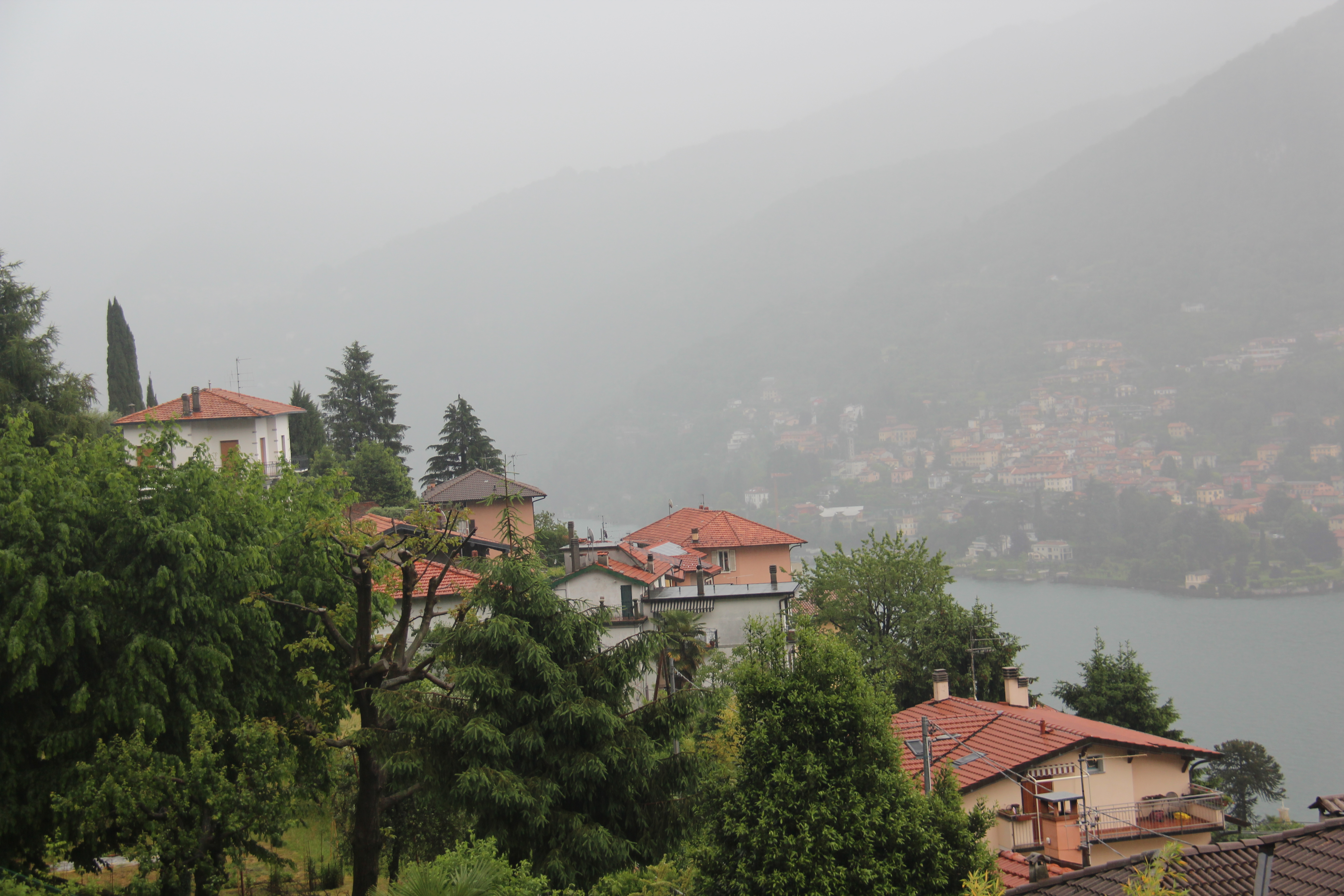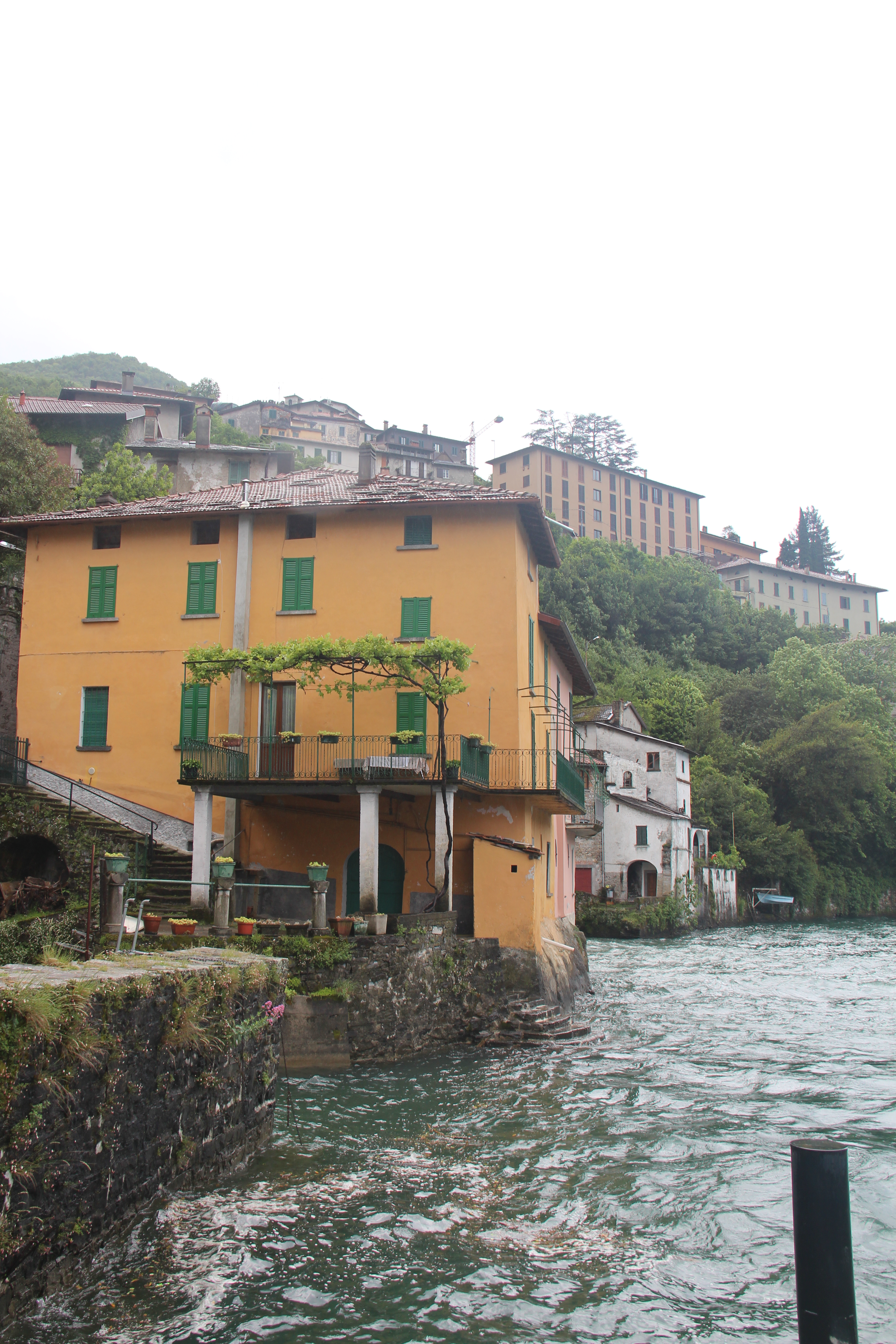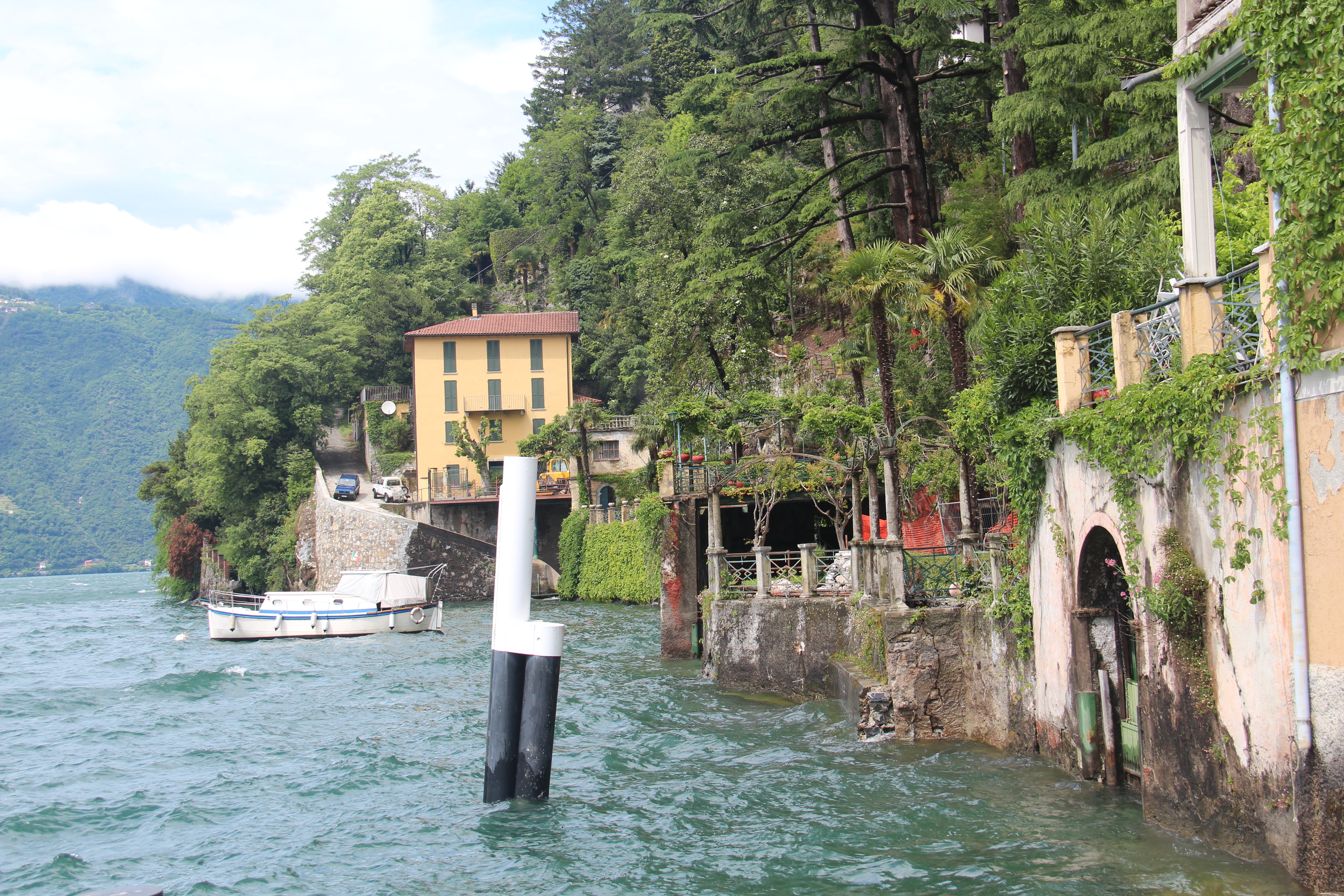 Later in the day when I got on the boat to the next village on today’s journey, Nesso, the rain and wind and cold was really awfull. I nearly decided to take the next boat back to Como town. Well, just as the boat landed an Nesso, the rain stopped. And, miraculously, the clouds quickly cleared and the sun appeared. I clearly saw this as a sign. Maybe I will have to come back to Nesso someday. It is another pleasant village perched on a steep hillside on the lakefront, but, Nesso, is a bit more isolated, and very much less touristy than Moltrasio and many of the other lake villages, and there are a lot of properties for sale at very good prices here, and, hey, George Cloony lives just across on the opposite side of the lake which is very narrow at this part of the lake. I think the Italians need a few more Americanos around, and George and his lovely new wife surely need a neighbor to water the plants when they’re away.