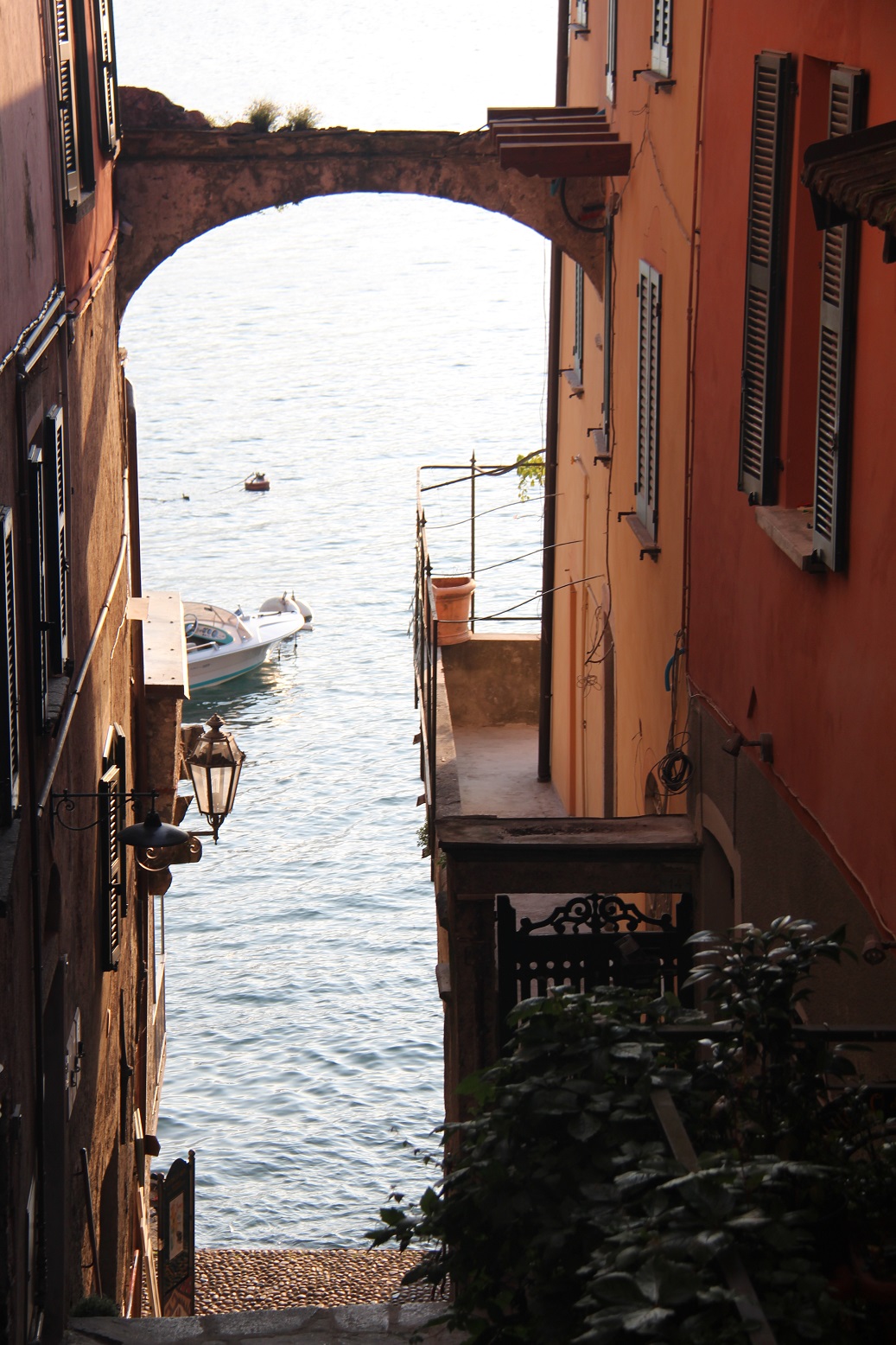 The lake shore promenade, or passaggiata as it is called in Italian, continues south where it passes alongside a steep rocky bluff by means of a narrow passageway which literally hangs off the side of a steep stone cliff. Continuing along the promenade, you come to the picturesque harbor of the older, main part of town which is lined with cafes and restaurants all competing for the the spectacular lake views which are best at sunset.. Varenna was originally a fishing village and its harbor still retains its former character. The public promenade ends here at the old harbor but he beautiful waterfront continues with the Villa Cipressi and Villa Monastero, both of which have fantastic lakeside gardens—I will cover these two villas in my next writing.
